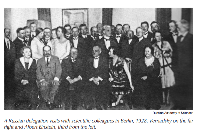 Nowadays, Vladimir Vernadsky is often compared to Albert Einstein: “His name is as inseparably linked with the biosphere as Albert Einstein’s name is with relativity” (Kauffmann, 1991). It is remarkable that two giants of scientific thought of the 20th century, Vladimir Vernadsky (1863-1945) and Albert Einstein (1879-1955), lived on Earth simultaneously. Unbelievable, but it actually happened that Vernadsky and Einstein once met. It was in 1927, when Vernadsky stayed in Germany for his research at the same time when there was a week of Russian science in Berlin, in which he participated. Einstein directed a group of German scientists for this event. According to Aksenov (1993, p.161), there is an old photograph from this scientific event, with both of them among the other members of the Russian and German delegations. I wonder – did they have a chance to talk?