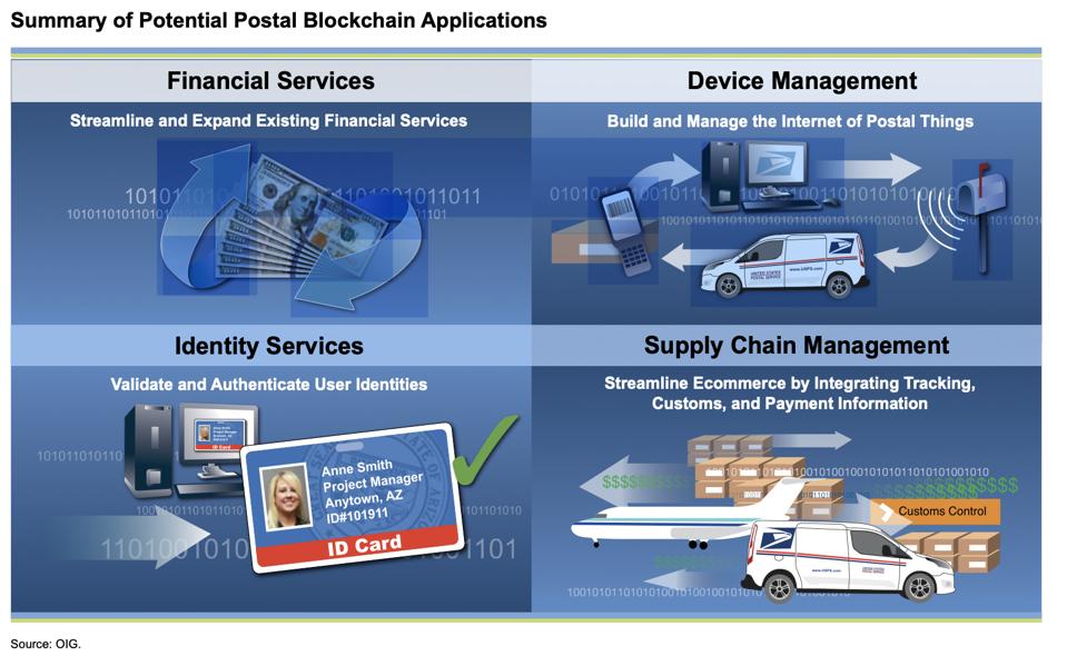 “U.S. Postal Service’s OIG explored blockchain applications in 2016 with a report. Applications include identity services and supply chain management.”