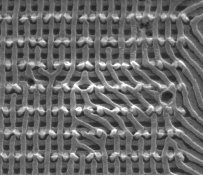 There were a number of barriers to overcome in making the system practical, Gotrik says. For example, the posts fabricated on the surface are the key to controlling the whole self-assembly process, but they need to be quite a bit taller than they are wide, which could lead some to topple over; the MIT team ultimately found materials and shapes that would be stable. “We explored a wide range of conditions,” Gotrik says. Graduate student Adam Hannon says the team used computer simulations of the structures in order to explore the effects of different post configurations on the double-layer 3-D structure. These simulations were compared with the most promising structures observed in the laboratory to get greater insight into how to control the resulting structures that formed. So far, the MIT team has only produced two-layer configurations, but Alfredo Alexander-Katz, an assistant professor of materials science and engineering, says, “I think it would be feasible to go to three layers” while still maintaining full control over the arrangement of structures on each layer. A key enabling technology was the MIT lab’s capability, using electron-beam lithography, to make 10-nanometer-wide cylindrical posts with precisely controlled positioning. These posts, in turn, guide the positioning of the self-assembling cylinders. Karl Berggren, an associate professor of electrical engineering, says it’s as if the lithography puts down an array of pillars, and these pillars then control the complex, multilevel routing of crisscrossing highways.