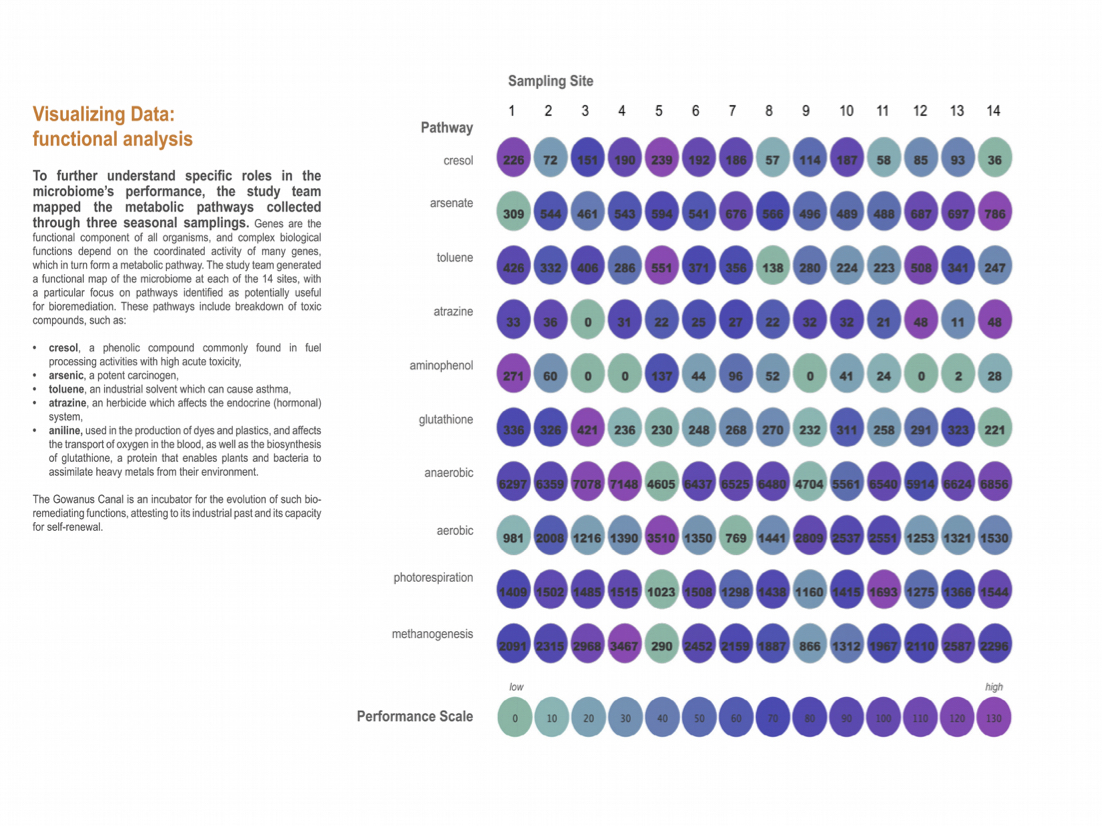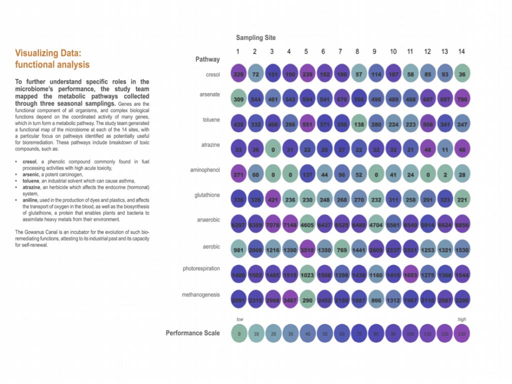 The findings also act as a ground truth of the types of pollutants in the canal, say Hénaff and Kolokotronis. “These microbially kept records can be more accurate than human kept records,” Hénaff explains. The microbe adaptations prove the presence of toxins that have gone otherwise undocumented in the environmental monitoring and regulation of the waterway. “There’s something poetic about the memory of these organisms,” she adds. In addition to the science, the researchers also synthesized their findings into a public art exhibit about the Gowanus Canal’s history and microenvironment, called CHANNEL.