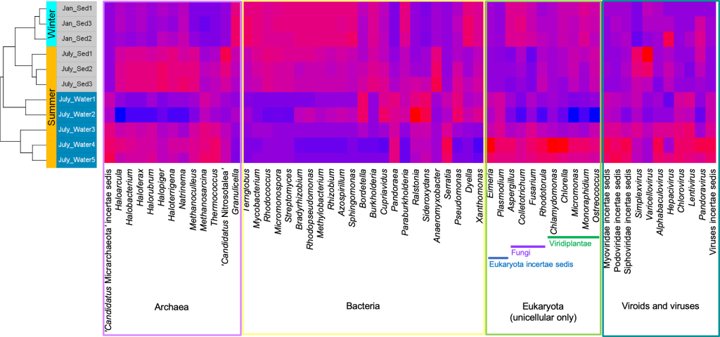 After plunging the pipe into the soft sediment of muck below the water and capping the top with a gloved hand, the person at the stern gently pulled it out while maintaining the vacuum. The person at the front of the boat, ready for collection with a 50 mL centrifuge tube in hand, guided the black slop from pipe to tube once the vacuum was released. Back in the lab, the research team extracted and sequenced DNA found in that sludge. “At first it came as a surprise to me that there was anything living in there,” says Hénaff, now an assistant professor in computational biology at New York University. “Now I know. Of course there are microbes there; there are microbes everywhere.”