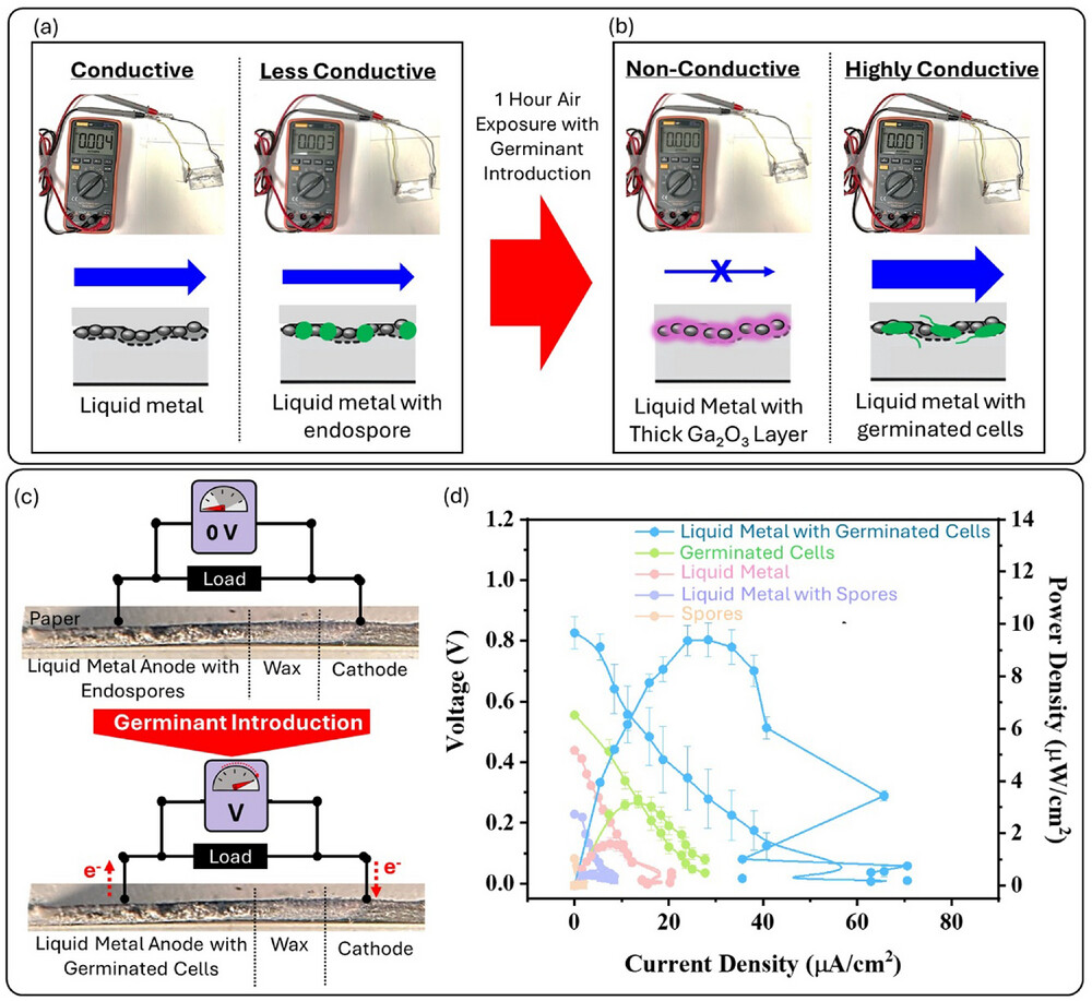 He believes that electrogenic bacteria—cells which generate small amounts of power—are the key. By combining liquid metal with dormant endospores of the bacteria Bacillus subtilis, which Choi has used to develop biobatteries, the composite material overcomes many of the limitations of liquid metal alone. “When we combine the spores with the liquid metal droplets, there is a huge attractive force, because the spores have chemical functional groups on their surface that interact with the liquid metal oxide layers. This strong force ruptures the oxide layers so the metal can be conductive.”
