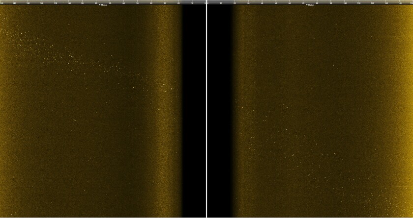 A number of unexpected challenges, including stubborn winds and heavy rain, complicated the process. When Terrill realized his crew would not be able to manually count each individual data point that the robots were collecting from the seafloor, he called in “the big data guns”: Sophia Merrifield, a physical oceanographer and researcher in the Marine Physical Laboratory at Scripps. Merrifield was astonished when Terrill sent her the first batch of sonar images. She jumped into action and started writing a computer algorithm that could sort through the immense amount of data while also accounting for the topography, the physics and the way sonar works in that part of the ocean. “Think about the geology on the bottom, because that affects the acoustics,” she said. “We talked pretty constantly while [Terrill] was out there: What are ways that we could train an algorithm to detect these targets in an automated way?”