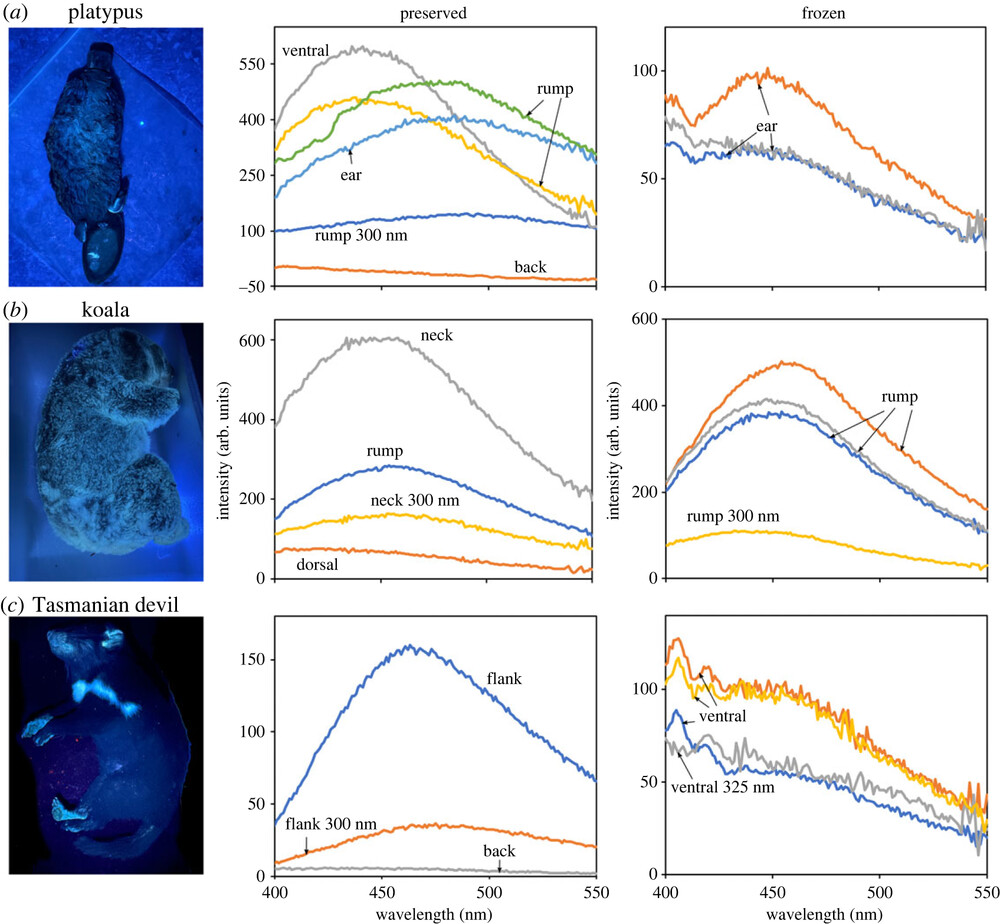 “Fluorescence spectra for preserved and frozen specimens of platypus (a), koala (b) and Tasmanian devil (c)”