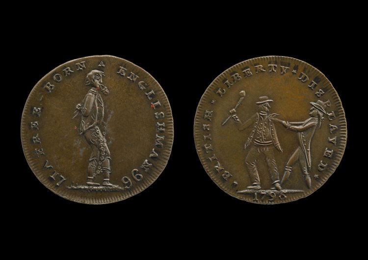 Metal tokens produced by the radical publisher Thomas Spence. Spence produced tokens like these as a means of circulating radical political messages and imagery amongst an audience which was often too poor to afford printed materials. The reverse of the top token contains an image of a man being press-ganged into military service against his will.