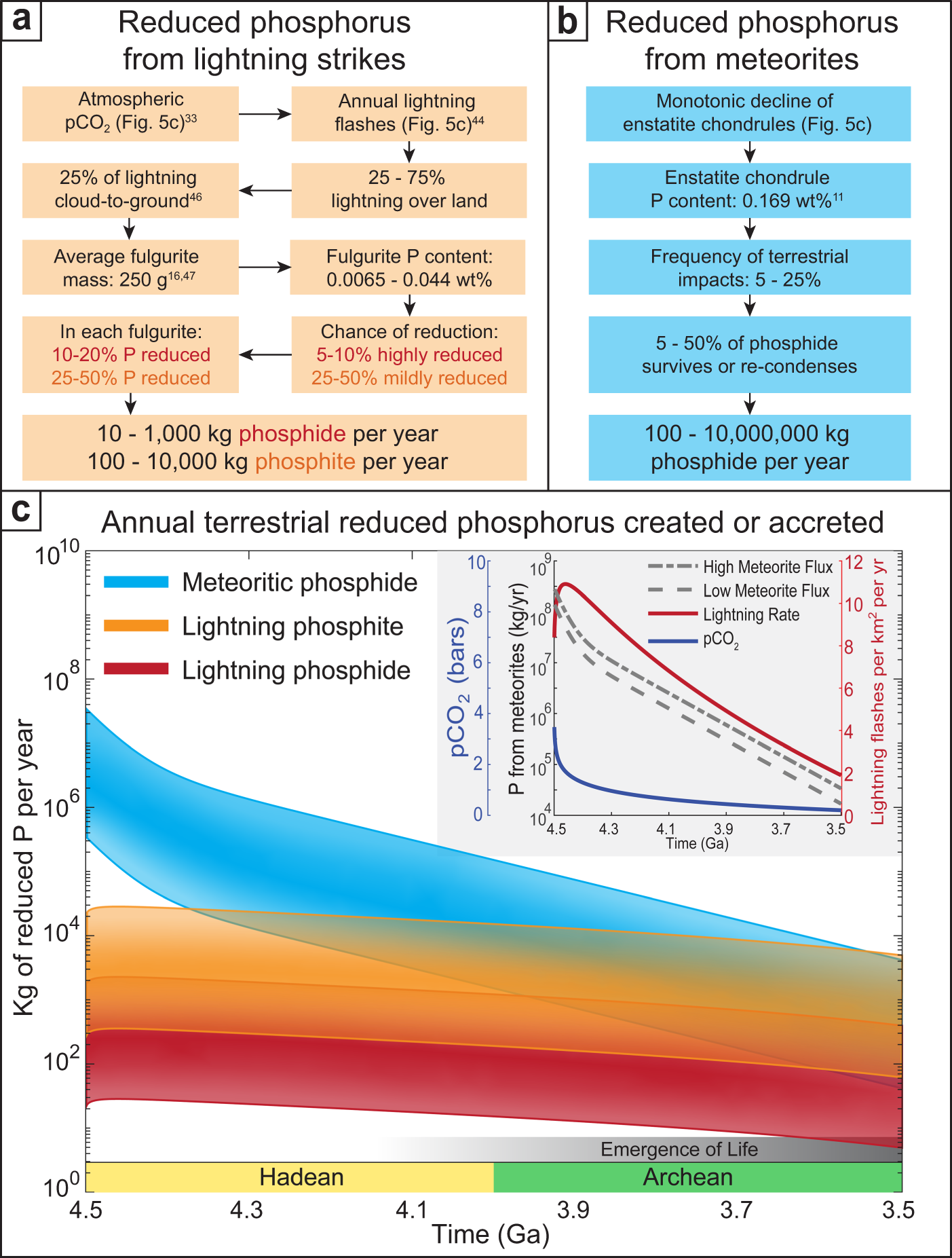 “(c) Mass range of reduced phosphorus produced per year from fulgurite-forming lightning strikes and meteorites as calculated in (a, b). Inset shows model inputs for atmospheric pCO2 in bars, lightning strikes per km2 per year, and annual total P in kg per year from meteorites11 as a function of time.”